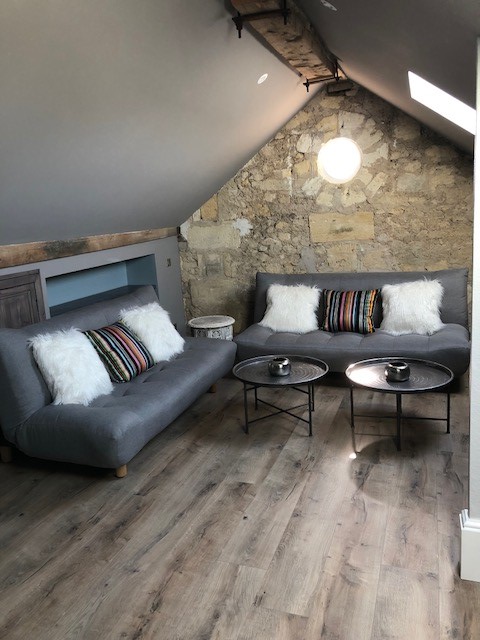 deux etages 3 ← Previous Next → The new seating area with sofas that double as extra sleeping space which allows for up to ten overnight guests in a pinch.